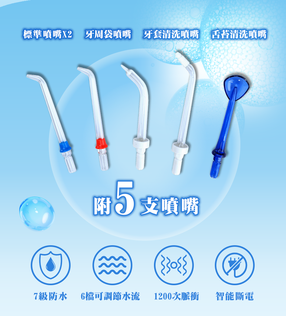 商品包裝內容 : 沖牙機本體、可分離式水箱、說明書、專業潔牙噴嘴套組 5 支
